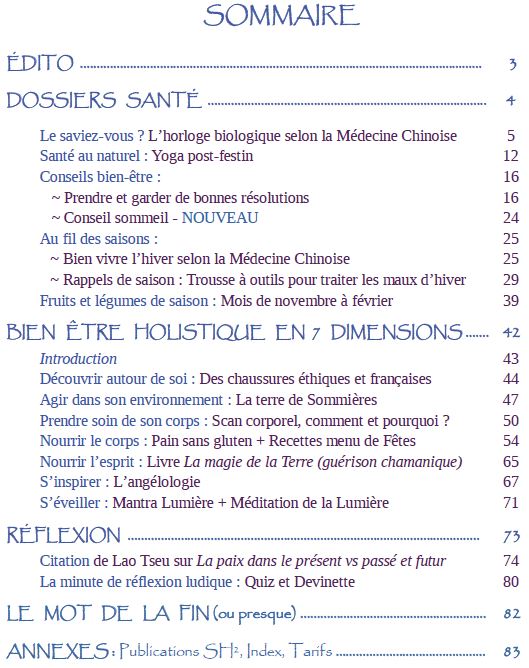 Informations, conseils, astuces, dĂ©couvertes… Au fil des pages, vous avez des outils pour prendre soin de vous, de votre corps, de votre ĂŞtre tout entier… De quoi Ă©galement vous accompagner sur un cheminement de dĂ©veloppement personnel et spirituel.